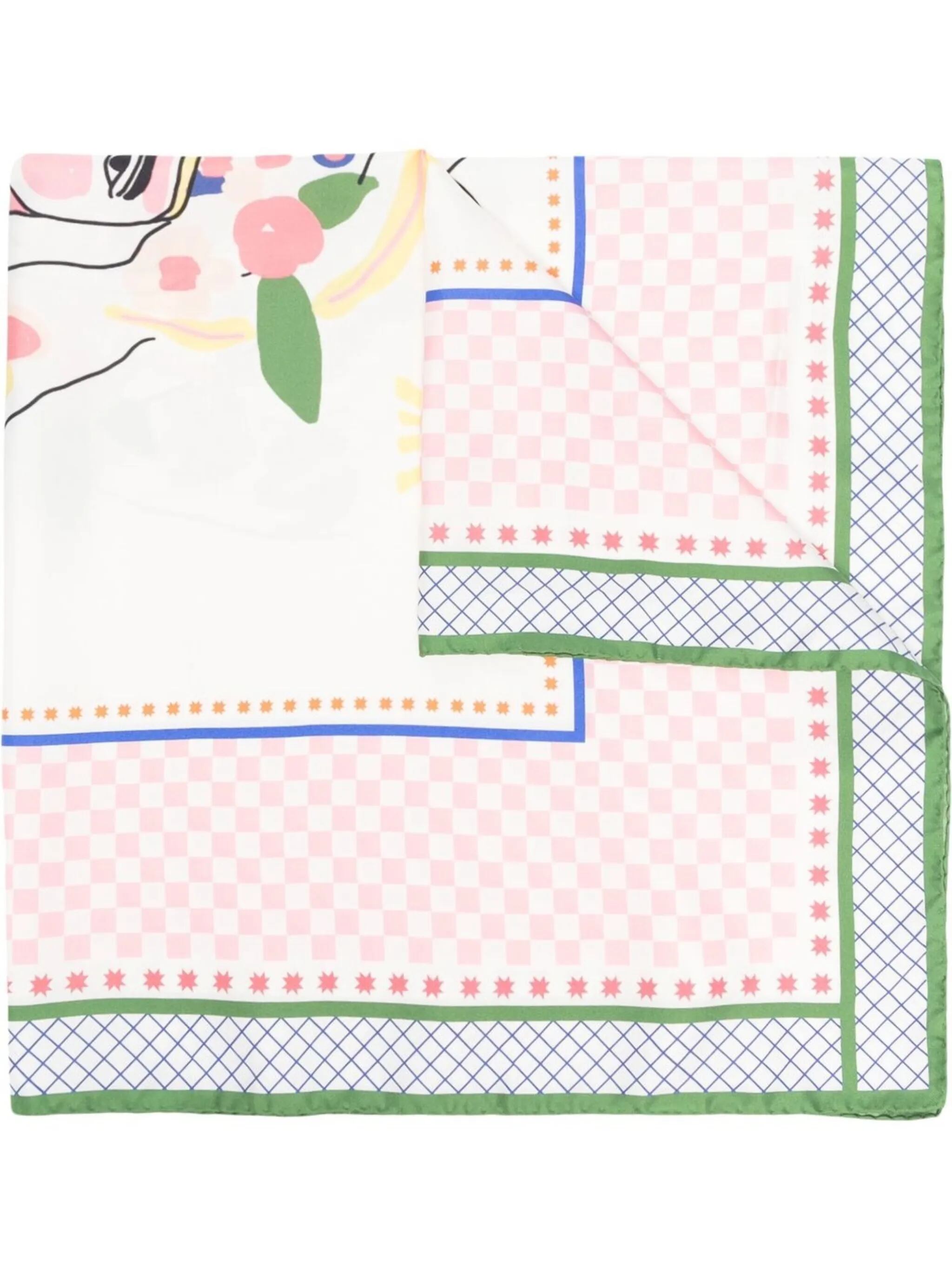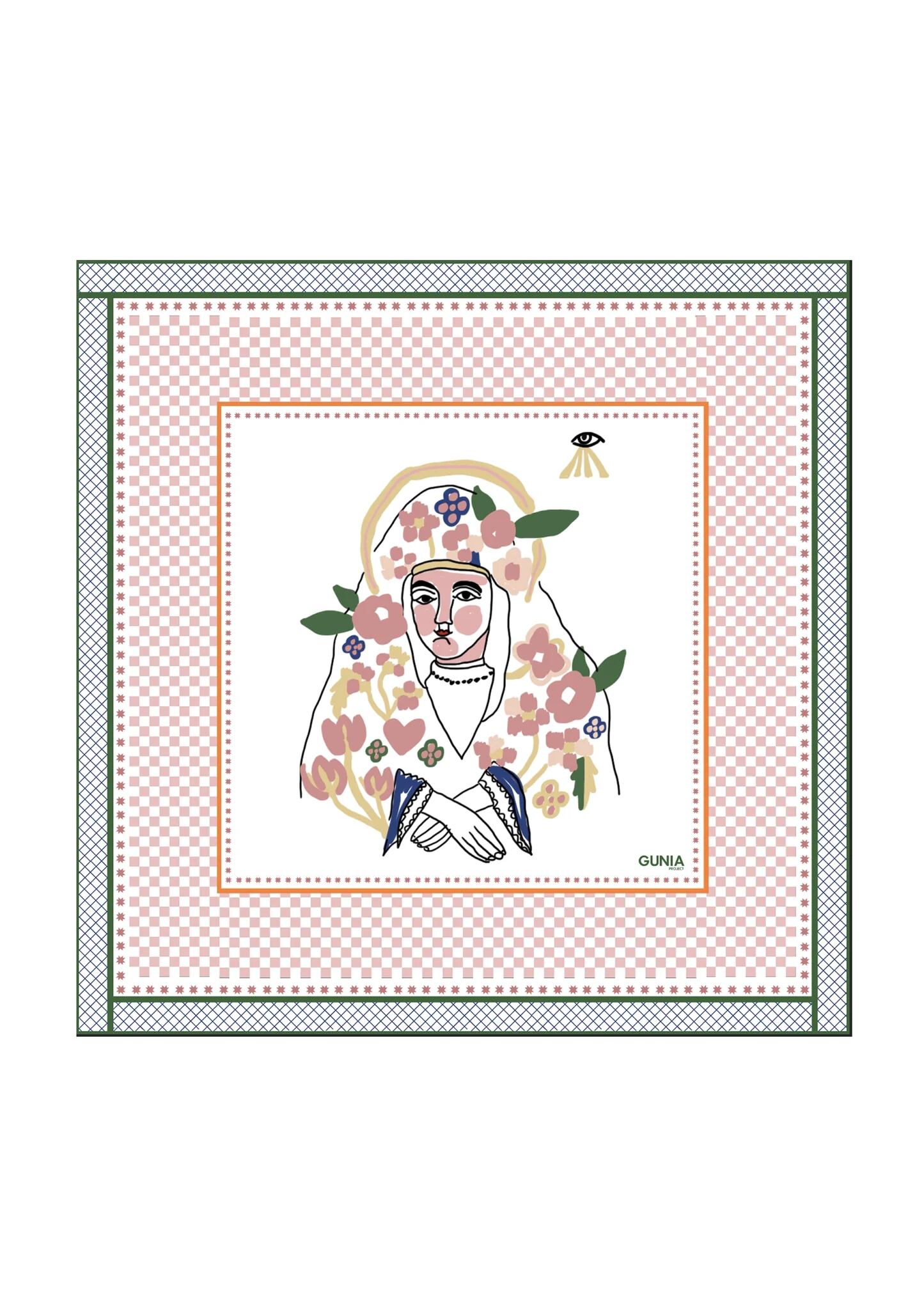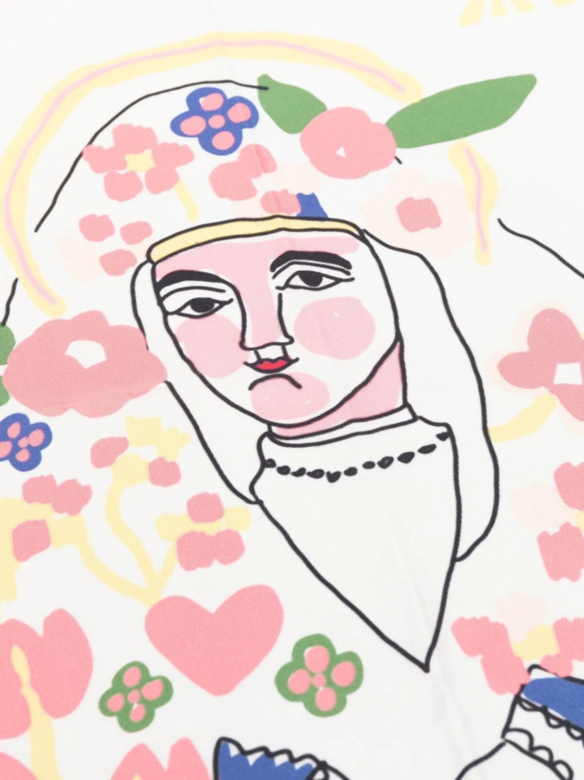 カーパティア地方の20世紀のガラスイコンに触発された聖女マリアのイメージをあしらったヘッドスカーフ。