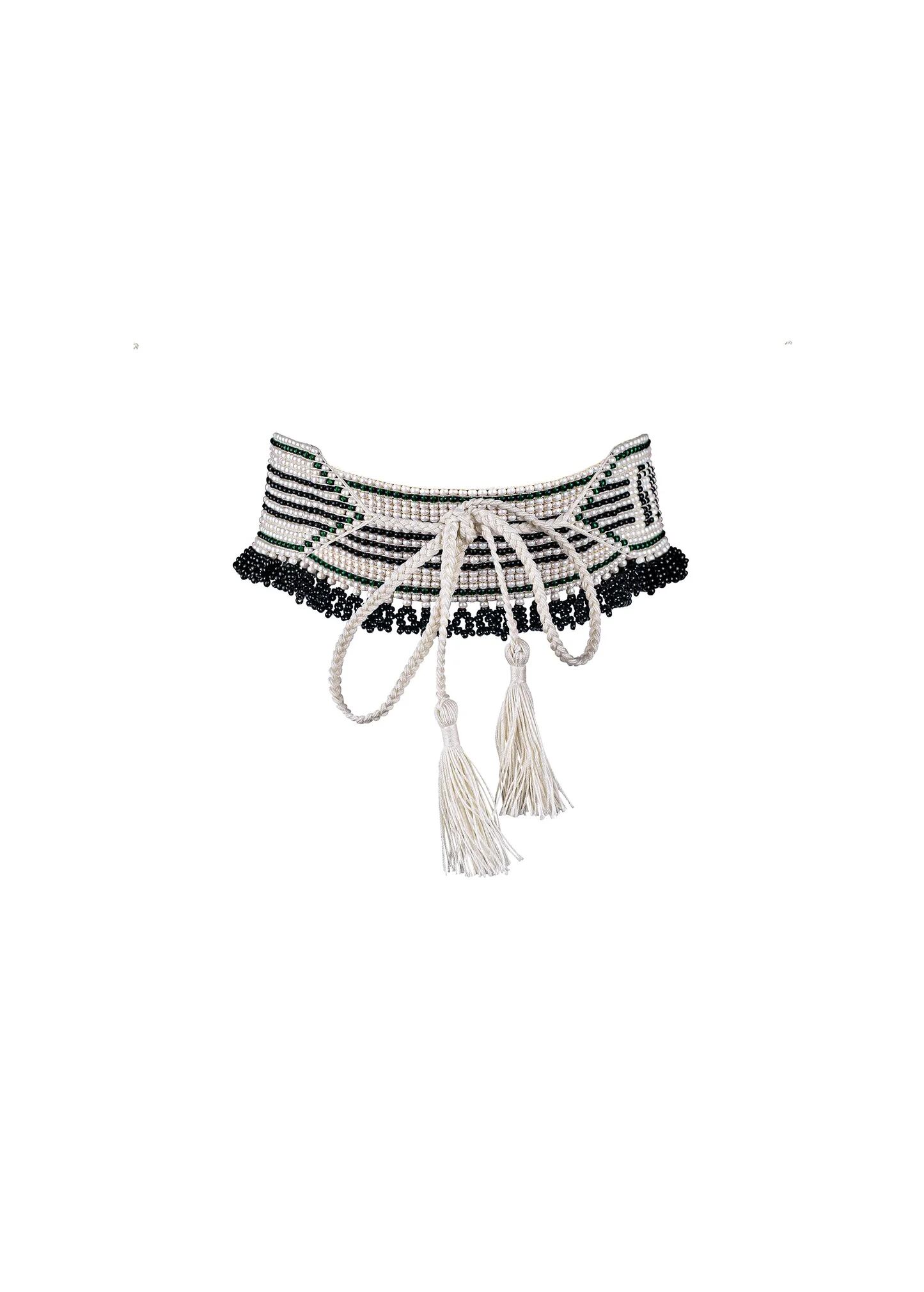 ウクライナの伝統的なジュエリーであるヘルダンをベースにしたこのアイテムは、さまざまな織り方や装飾スタイルを表現しています。作品の下部は、伝統的なドロップで飾られています。