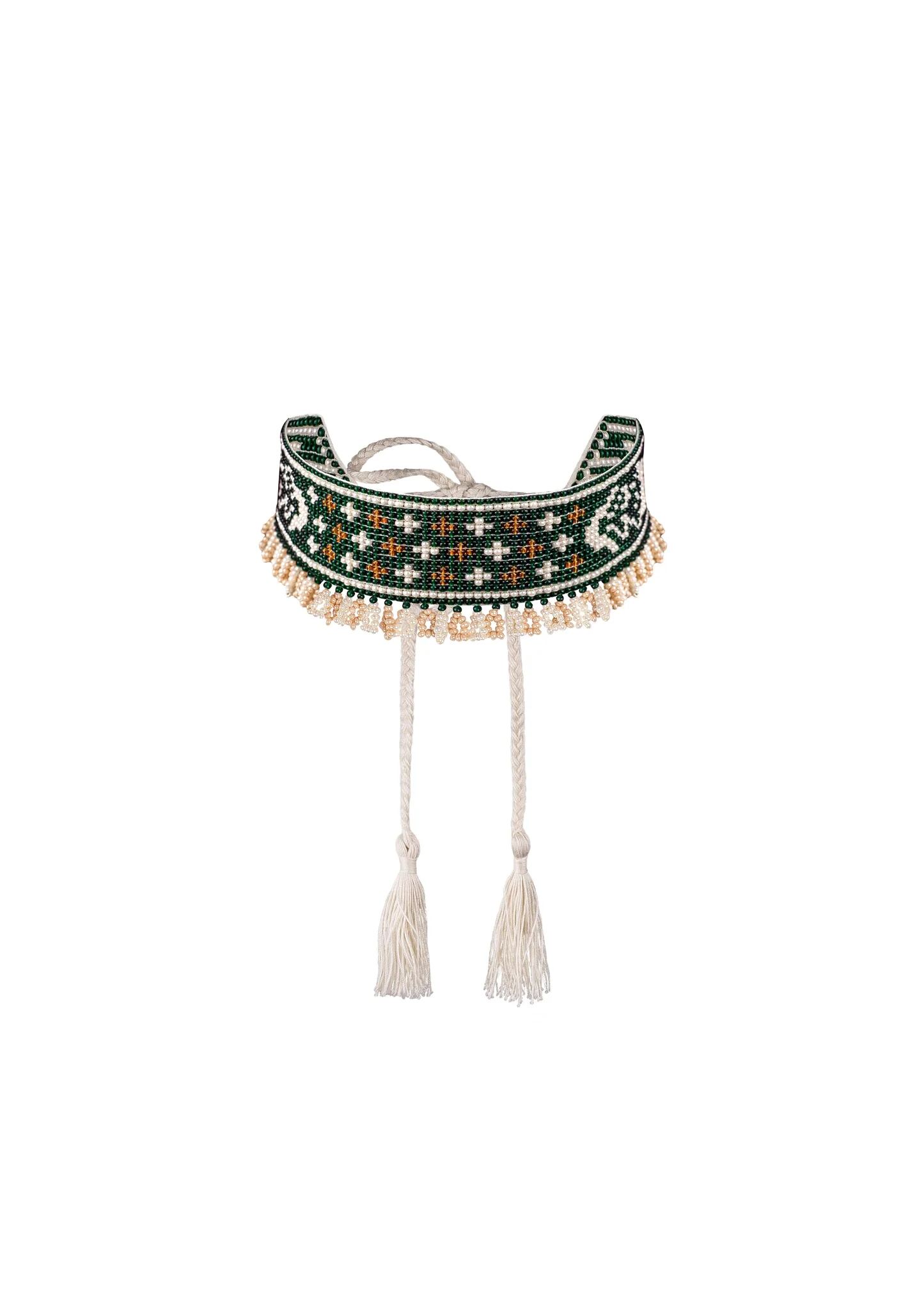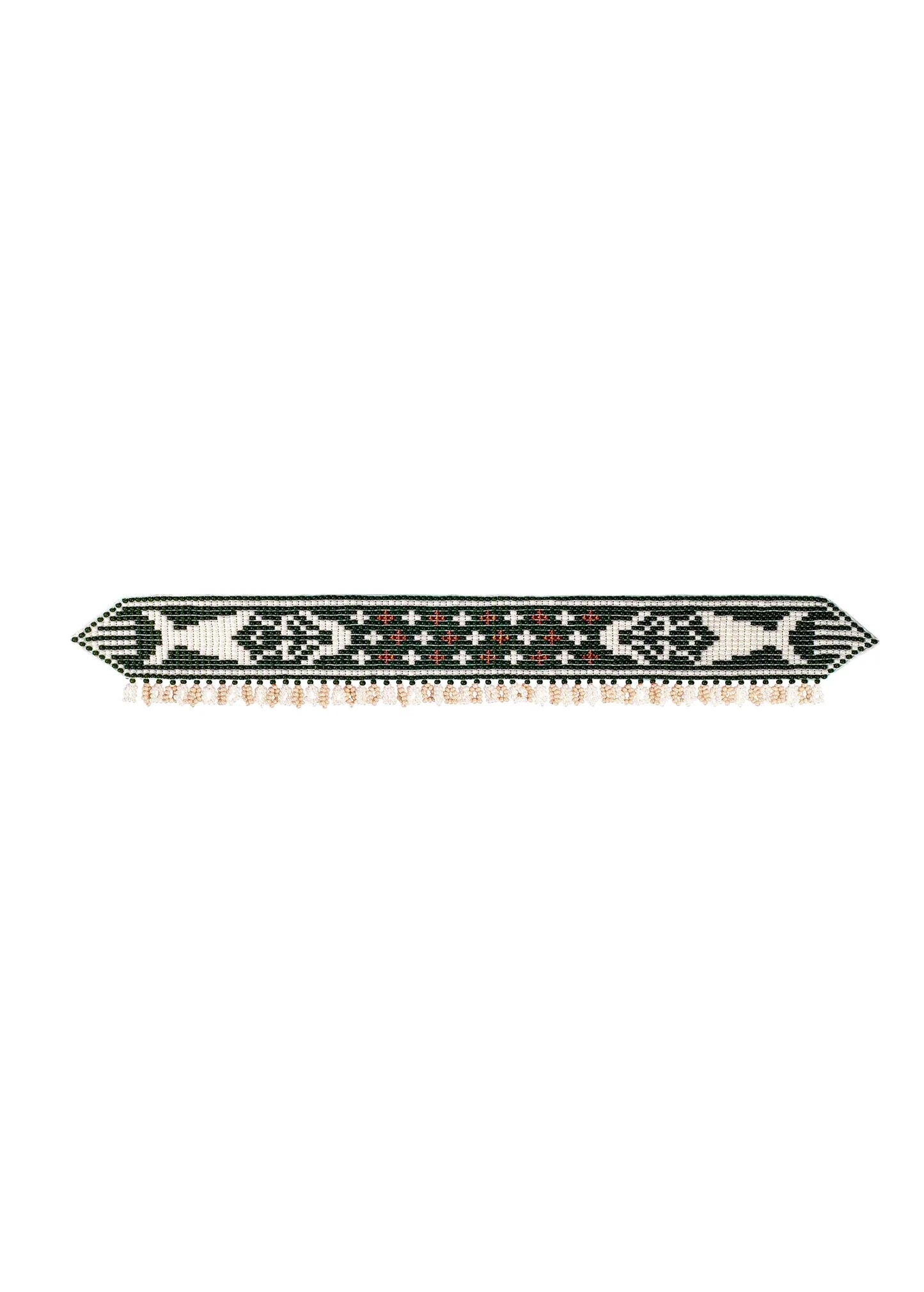 ウクライナの伝統的なジュエリーであるヘルダンをベースにしたこのアイテムは、さまざまな織り方や装飾スタイルを表現しています。作品の下部は、伝統的なドロップで飾られています。