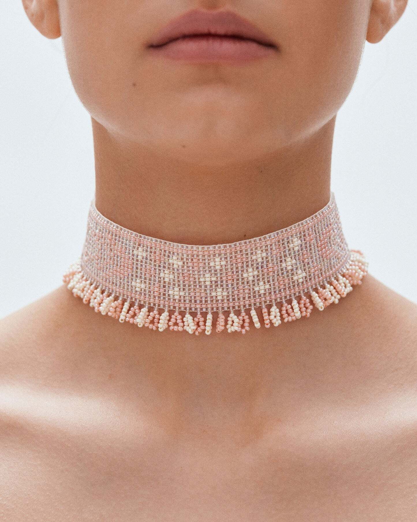 ウクライナの伝統的なジュエリーであるヘルダンをベースにしたこのアイテムは、さまざまな織り方や装飾スタイルを表現しています。作品の下部は、伝統的なドロップで飾られています。