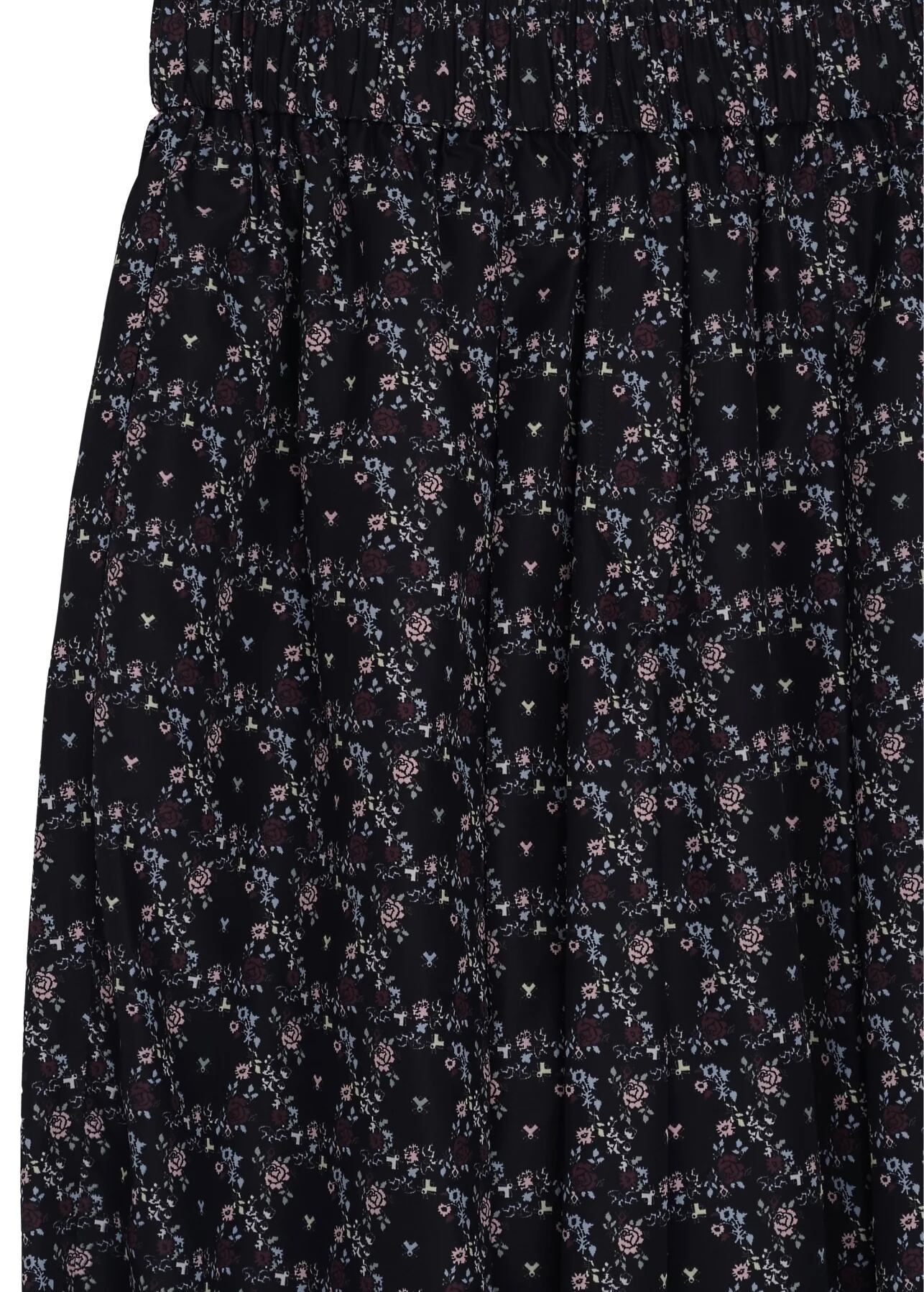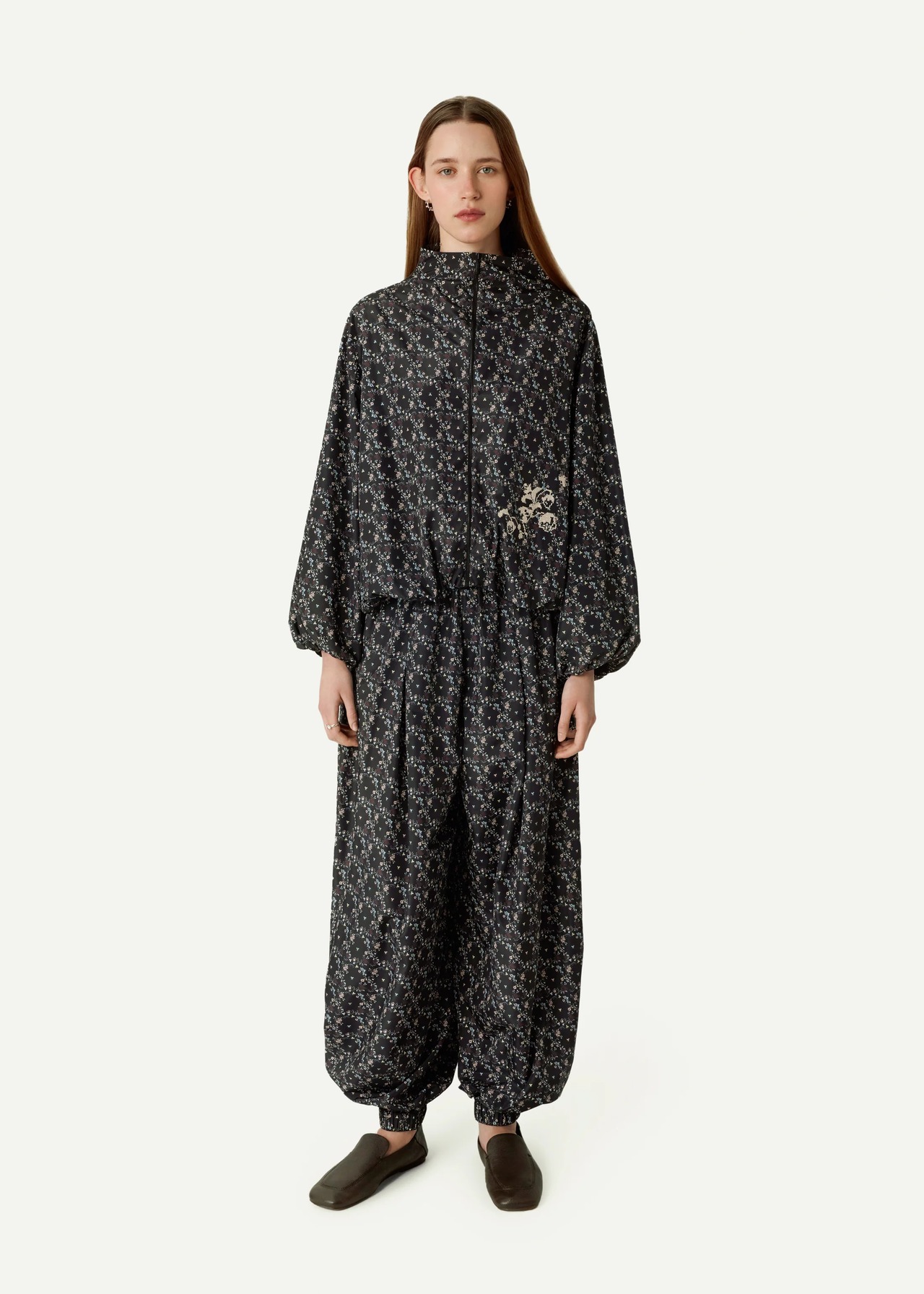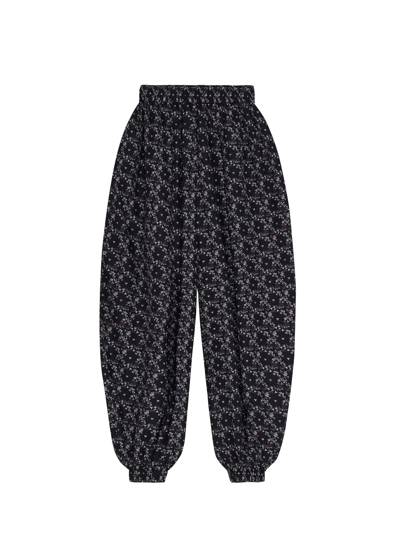 ウエストはゴム仕様、軽やかなナイロンタフタ素材にデザイナーパターンをあしらったトラウザー。デザインは、ウクライナ伝統衣装の要素であるシャロヴァリのシルエットをさりげなく再解釈し、対照的なスタイルをバランスよく融合させています。